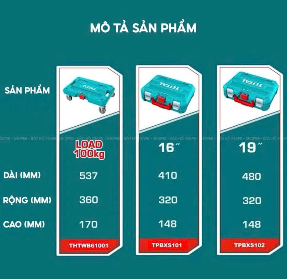 - Hộp đựng đồ nghề M (TPBXS101) và hộp đựng đồ nghề L (TPBXS102) có thể xếp chồng lên nhau trên ván lăn, dễ dàng vận chuyển
